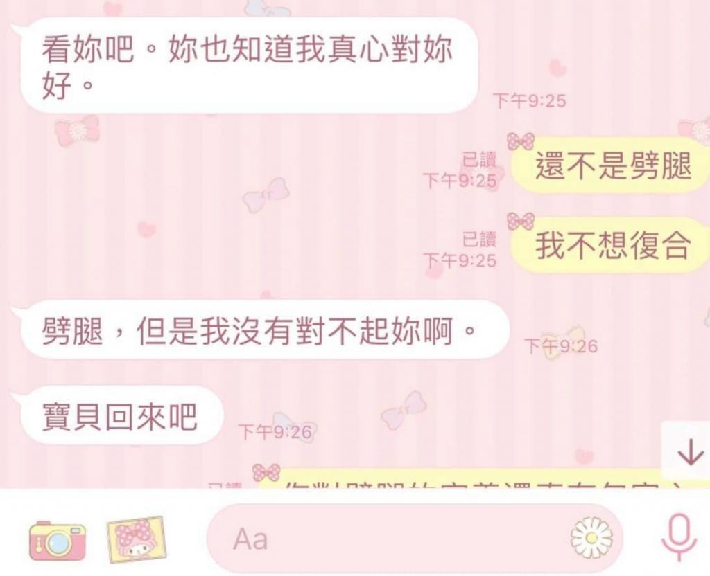 可是女生不為所動,更直斥對方劈腿,搭上了別的女生,又想吃回頭草。
