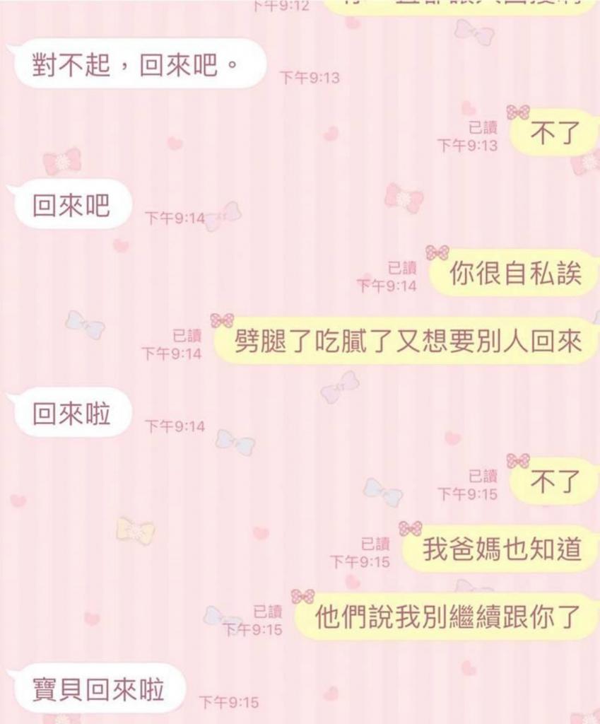 直言她的父母已經知道分手的事,「你很自私誒,劈腿了吃膩了又想要別人回來」。