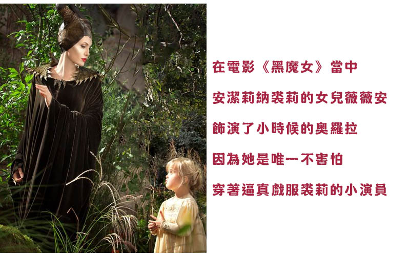 在電影《黑魔女》當中,安潔莉納裘莉的女兒薇薇安飾演了小時候的奧羅拉,因為她是唯一不害怕穿著逼真戲服裘莉的小演員!