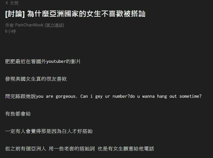 就有網友在PTT表示為什麼"為什麼亞洲國家女生不喜歡被搭訕??"