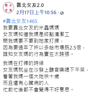 女友媽媽多付行情2.5倍的薪資請原職清潔工的母親到家打掃,但女友媽媽卻從頭到尾都坐在沙發上,聽著音樂喝著下午茶,看著我媽一個大她10歲,還有心臟病的人,忙前忙後都不會覺得不好意思」,女友媽媽跟本是米蟲吧。