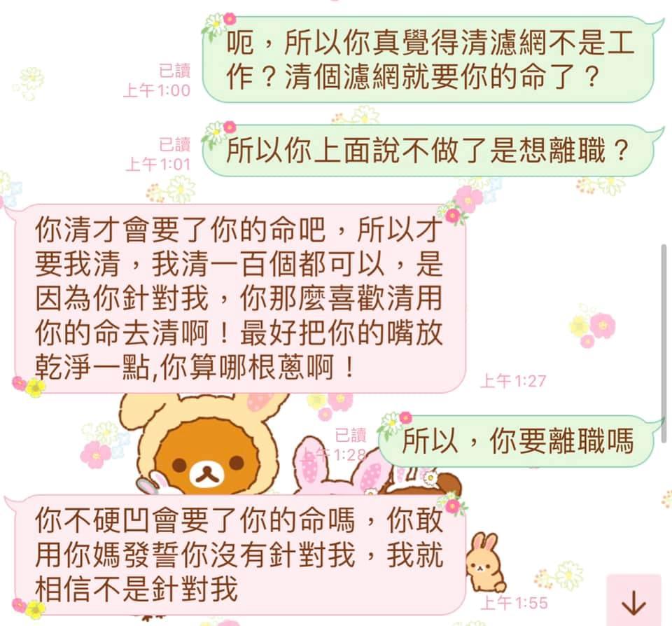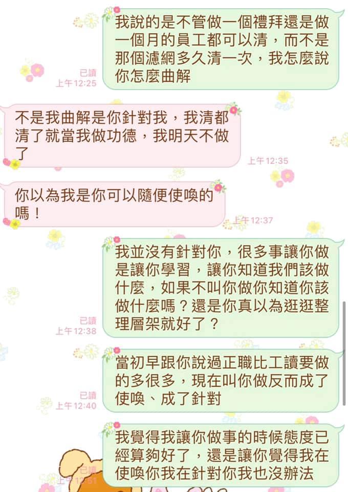 另外說一下,這位員工平常安安靜靜,找話題跟她聊天大多回答都不超過三個字,所以她在LINE上這樣激動,讓我覺得有點害怕