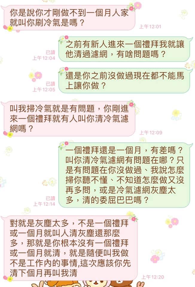 「=.= 清個冷氣濾網也能崩潰成這樣~ 正職時間長,冷氣濾網不清只會越來越不冷,這種常規性的工作內容是蠻正常的啊。」