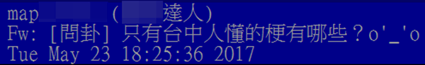 批踢踢上有位自稱木柵于晏的網友和廢宅心有戚戚焉,這名網友表示:和一群台中人聊天,結果台中朋友一直聊中港路、小時候常去科學博物館、早餐喜歡吃炒麵,讓他忍不住問「只有台中人懂的梗有哪些?」