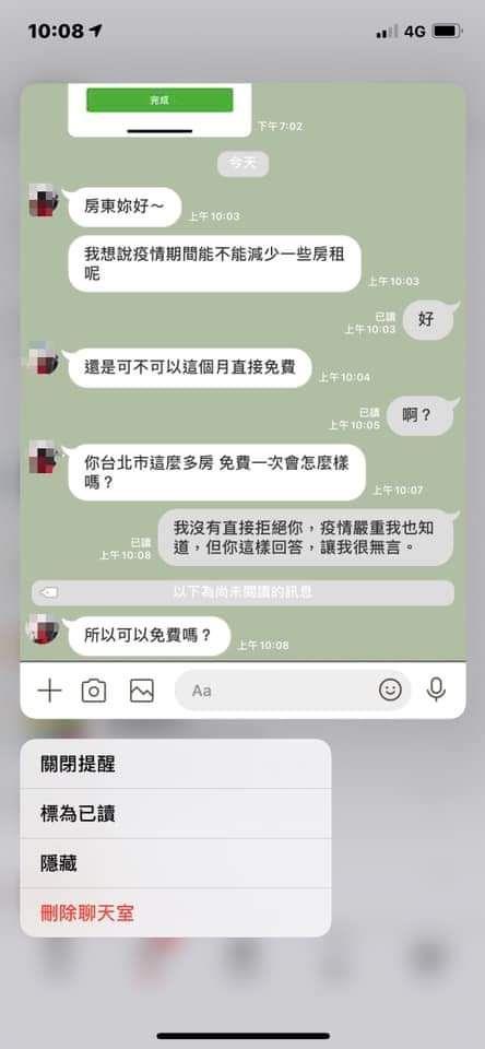 「房東妳好,我想說疫情期間能不能減少一點房租呢」
