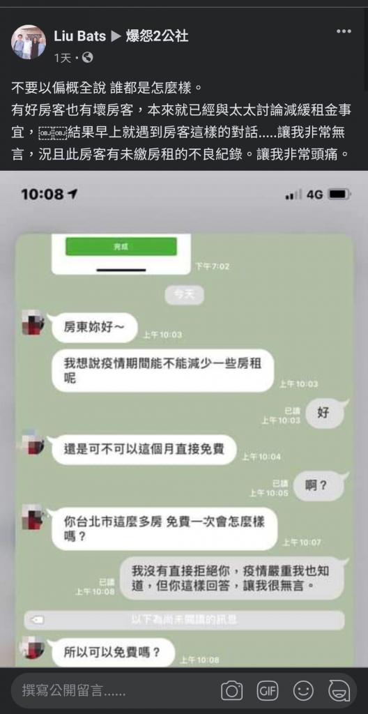 更傻眼的是租客非但不收斂,反而再一次詢問可不可以免費不繳房租,讓房東生氣的在社團發文「不要以偏概全說 誰都是怎麼樣。有好房客也有壞房客,本來就已經與太太討論減緩租金事宜,結果早上就遇到房客這樣的對話…..讓我非常無言,況且此房客有未繳房租的不良紀錄。讓我非常頭痛。」