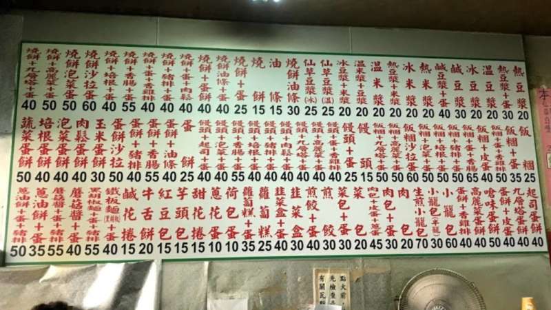 這間店有賣燒餅油條、飯糰、蛋餅等等,應該是一間傳統的豆漿店。店家貼心在牆上掛好菜單,菜單上列出了所有的餐點選項和價格。