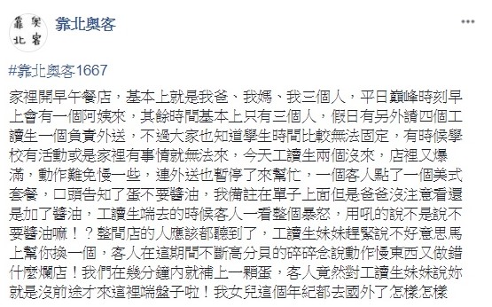 工讀妹妹立刻致歉說幫她換一個,這時奧客不斷高分貝叨念說:「動作慢,東西又做錯,什麼爛店!」幾分鐘後,他們補上一顆蛋,可是奧客卻對工讀生妹妹說:「妳就是沒前途才來這裡端盤子啦!我女兒這個年紀都去國外了!」