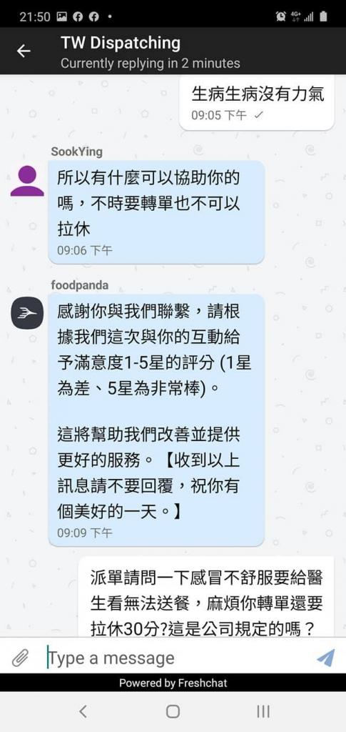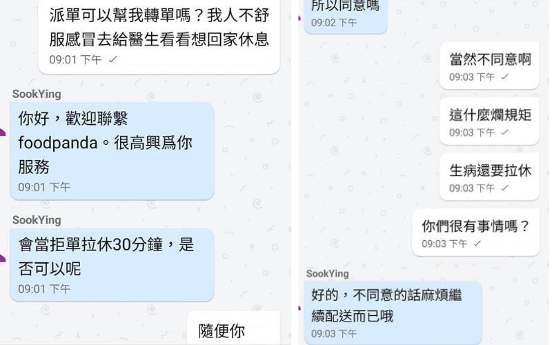 網友發文『請大家評理一下,我不知道是派單客服的問題?還是公司真的這樣規定?我是位熊貓外送員,承接任務要到店家取餐,在半路身體不舒服感冒四隻無力,還拉肚子咳嗽還全身酸痛,想去醫院掛急診,然後回報派單竟然跟我說要當成拒單還要拉休30分(注意我沒有按取餐),不願意是因為我沒有做錯什麼事情為何要接受這樣的處罰?』