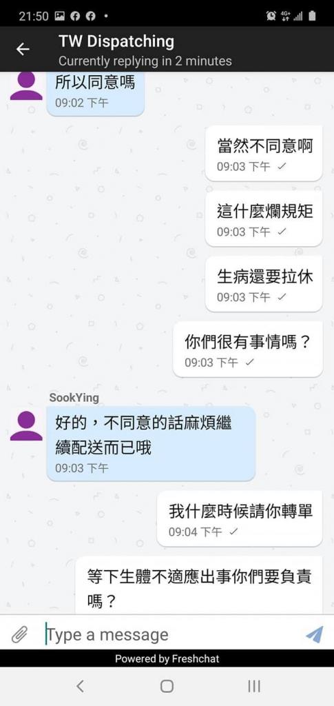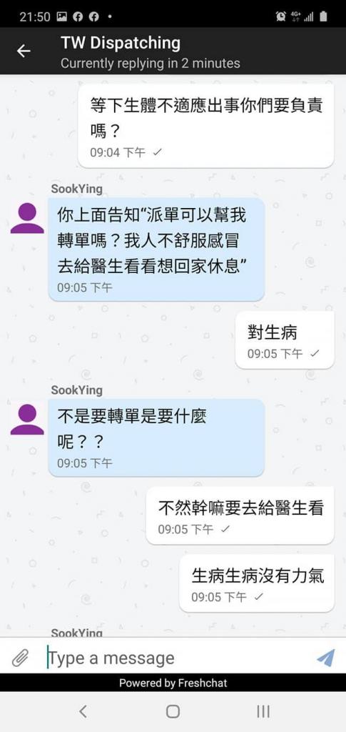 「沒辦法接單那何必按接受,不到店取餐就是拒單了你有什麼問題? 啊你要看醫生,轉單就是拒絕接單 ,扣接單率也是剛好,拉休看醫生也是剛好,你還有什麼問題?」