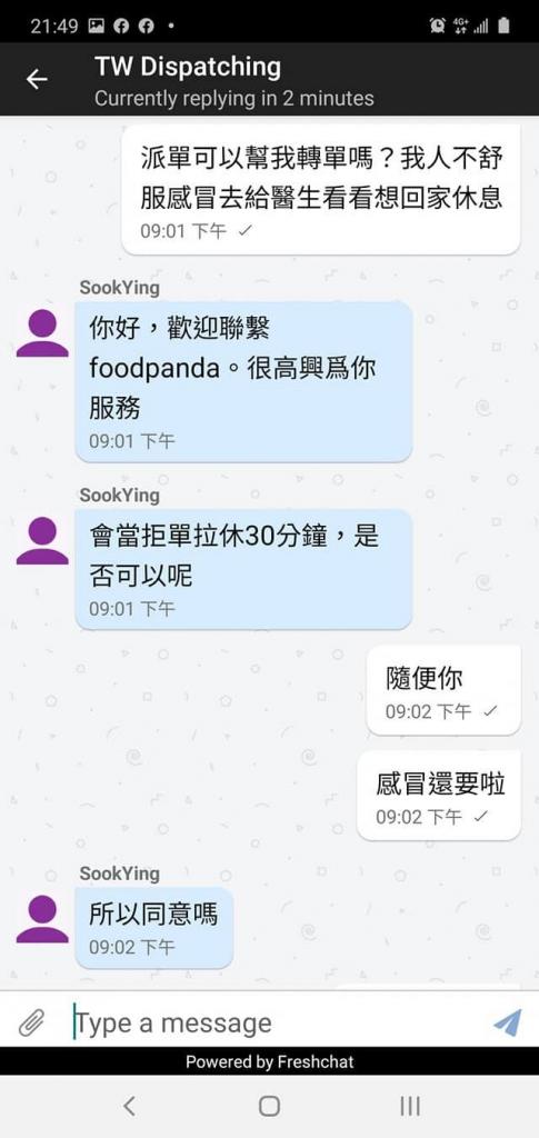 因為不滿身體不適要求休息,卻被平台拉休30分鐘,熊貓外送員怒發文抱怨!