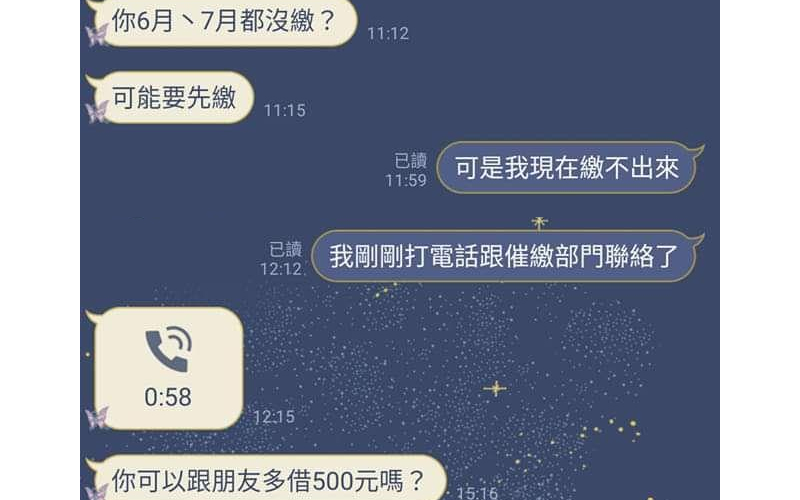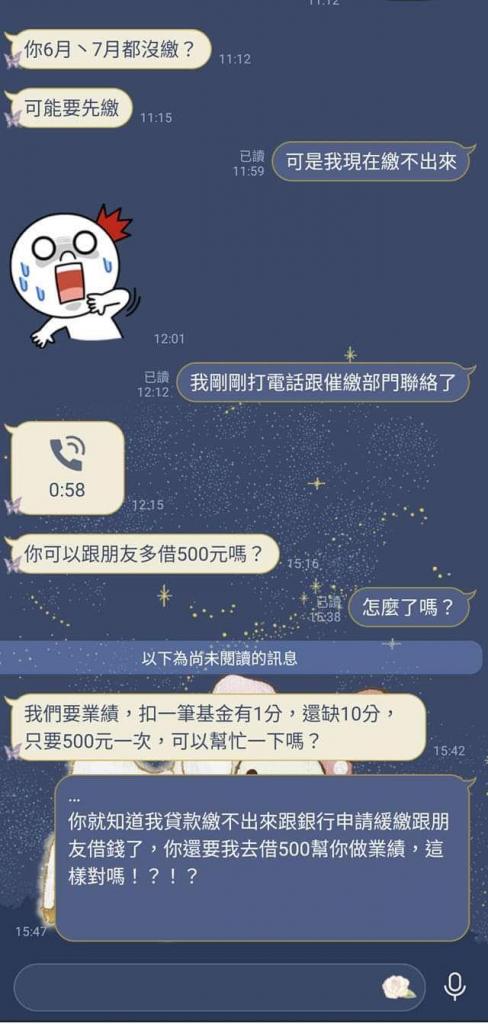 「對方明知道樓主貸款都繳不出來了,哪來的勇氣叫樓主借錢幫忙衝業績@@」