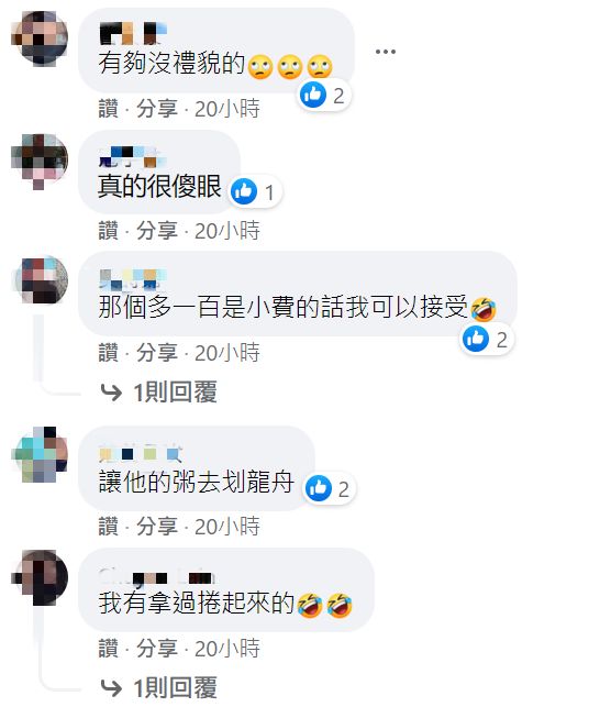 貼文曝光後也吸引其他外送員回應,大家紛紛留言表示「洗衣機拿出來的?」、「這完全就是故意的啊」、「這看起來是新鈔,而且是故意揉成團的,這種人太可惡了」、「不尊重錢,也不尊重人」、「我會把他餐點搖一搖拿給他」、「這是在 糟 蹋 人吧」,不少人認為無論原因為何看起來都相當不 禮貌,不過也有網友指出另一種「黑心」的可能。