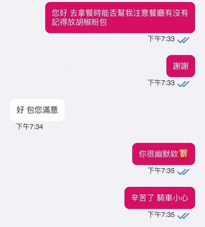 遇到浮誇外送員哭笑不得「我只是要胡椒粉啊」,到底是貼心還是….