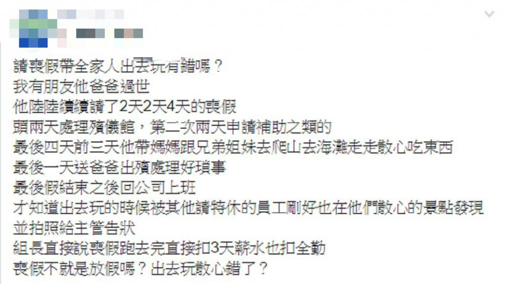 但原PO認為「請假處理爸爸後事,本來就是合理的,在請假天數內出去散心,難道錯了嗎?」