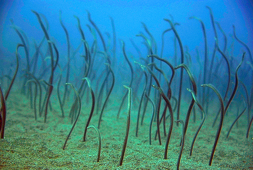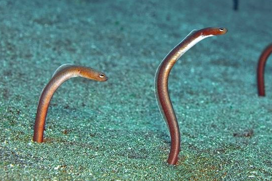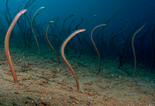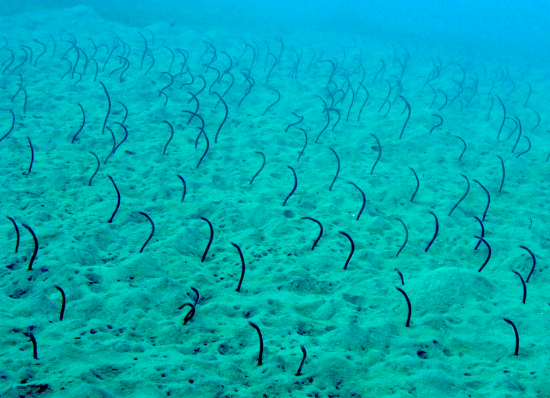 出水后,他立即向教練進行請教。原來這是一種名叫花園鰻的海洋動物。它是一種是群棲的動物,平常白天下半身埋在砂地,只露出上半身在水層中啄食浮遊動物,這才有了海底壯觀嚇人的一幕。