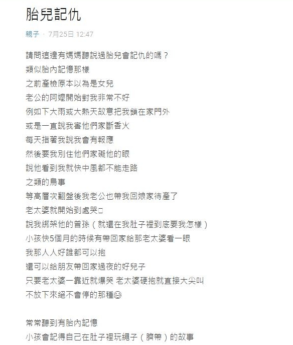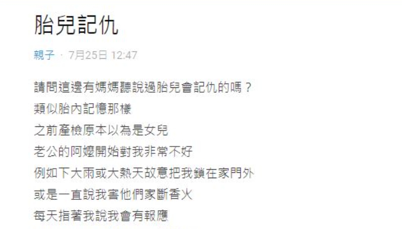 有一位媽媽在dcard發文表示,原本懷孕是好事一樁,家人也都期待孩子的到來,誰知道產檢後發現,肚子裡面的孩子應該是女生,老公的阿嬤得知後,馬上就態度大轉變,除了在生活上刁難,故意在大雨天、大熱天,把她關在門外面,還說根本就是因為她,讓家裡斷了香火,只要看到這名女網友,就一直驅趕去別的地方,還說都是因為懷了女兒,讓自己的中風發作。