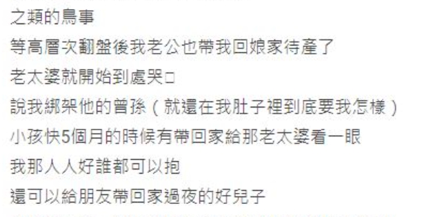 直到發現肚子裡面懷的是兒子後,因為家裡鬧得也不愉快,老公就帶著她回娘家待產,沒想到當初還擺臉色的阿嬤,竟然到處哭訴,說曾孫被帶走,讓她實在很無奈,直呼:「就還在我肚子裡面是要怎樣!」不過還好後來也順利生下來了。