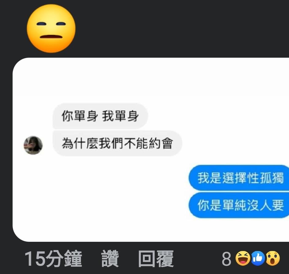 「我也蠻不喜歡這句的相信很多人都是選擇單身只要整齊乾淨,五官還看得出來真的要將就隨便找都有」