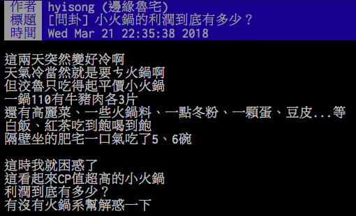 有網友到PTT發文詢問「小火鍋的利潤到底有多少?」