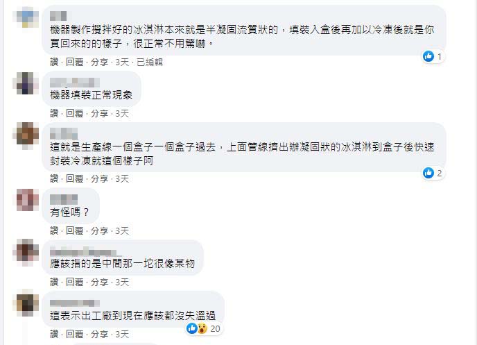 對此,有內行網友進一步解釋,指出冰淇淋裝盒前,本來就已經由機器製作攪拌好,為半凝固流質狀態,因此填裝進盒子再快速冷凍後,中央就會出現管線擠出的形狀,若販賣、運送中途都沒有發生融化,就會是原PO所看見的景象,因此不用過度擔心。