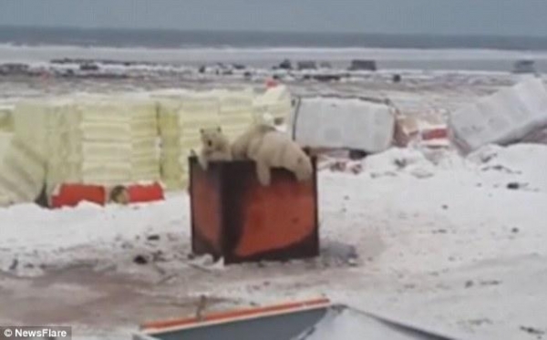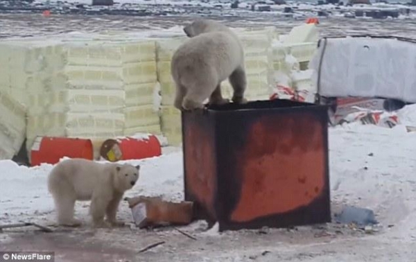 闖進工地的這幾隻北極熊,一下子就撲到了垃圾桶上面去,牠們是想在垃圾桶裡翻出一些人們吃剩的飯菜,填一下肚子。
