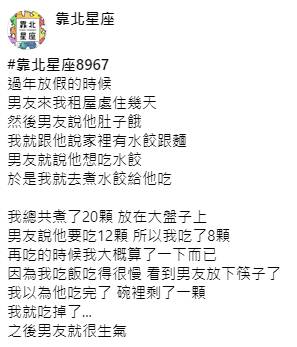 水餃也能成為情侶之間吵架的理由?最近一名女網友在臉書社團「靠北星座」分享說,過年放假期間,男友到她租屋處來住。