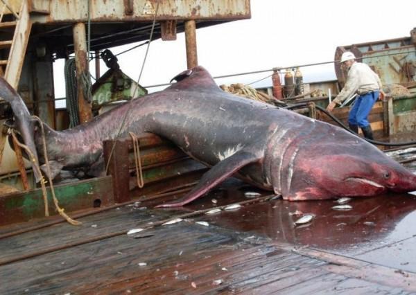 一頭巨型鯊魚--人類濫捕的犧牲者。當魚類從深海被突然拉出來,必須承受急劇的水壓變化,它們的內臟破裂、眼睛突出,往往痛苦地窒息而死。