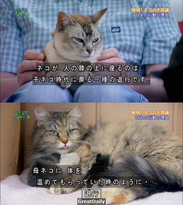 紀錄片講到一個叫做「退行」的理論,意思是長大的家貓宛如變回幼貓的表現,這些表現包括……