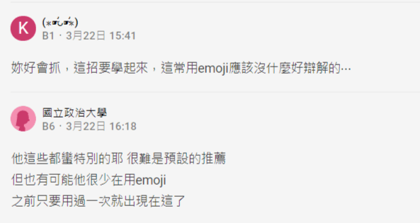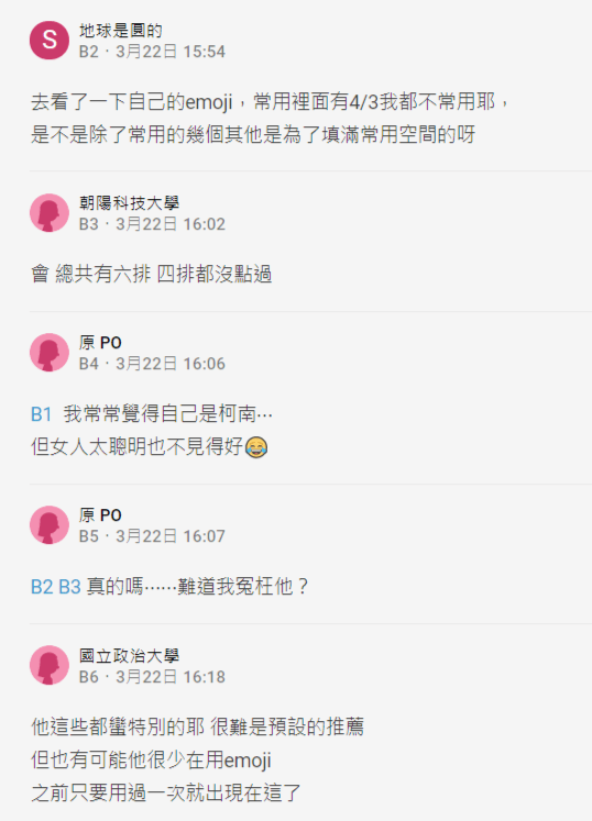 有網友則認為原po想太多,「我的常用項目全部都是近期用過的,從其他沒用過emoji隨便選一個點他也會跑到常用項目裡面」、「說實話我覺得妳想太多了」、「去看了一下自己的emoji,常用裡面有3/4我都不常用耶,是不是除了常用的幾個,其他是為了填滿常用空間的呀」、「現在的人都好沒有信任喔」、「不小心點到也會出現在常用項目啊」。