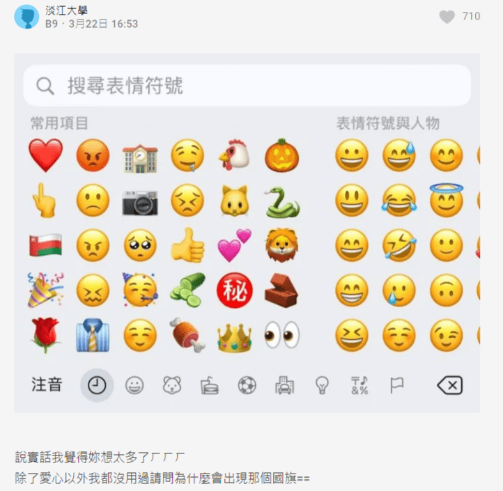 一名網友在「Dcard」感情版發文,她在察看老公的手機時,發現鍵盤的emoji常用項目並不是常常對自己使用的圖案,圖案包含各種愛心、星座、ID等等,但是詢問老公「有對誰使用過」,他卻完全否認表示,「沒有用這些圖,不知道為什麼跑出來」,查看對話紀錄也沒看到對方使用這些符號,猜想對話紀錄可能刪掉了,於是想問問網友們,「沒用的表情符號,難道會自己跑出來嗎?」。
