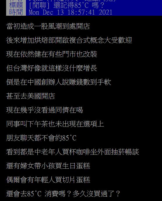 原PO印象中創辦人曾說85°C在中國賺錢數到手軟,甚至去美國開店。不過在台灣,原PO現在幾乎沒看過有同儕在喝,「同事叫下午茶也未出現在選項上,朋友聊天都不會約85°C」,每次經過85°C看到的都是中老年人買杯咖啡,坐外面抽菸,或是婦女帶小孩買生日蛋糕,偶爾才會有年輕人買切片蛋糕,於是詢問「還有人會去85°C消費嗎?多久沒買過了?」。