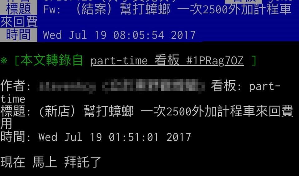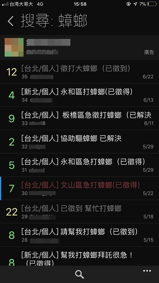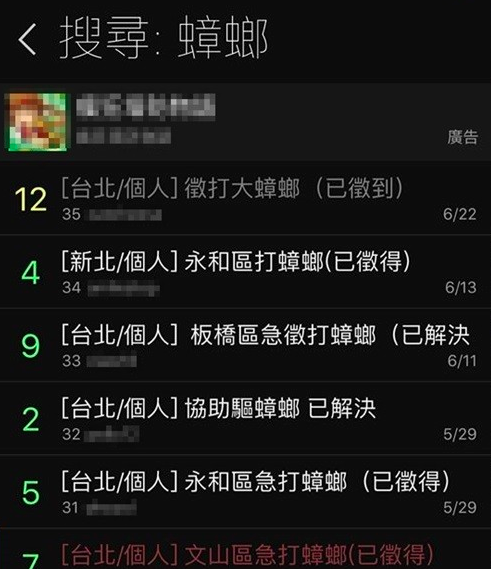 從圖中可見,原來在PTT上搜尋「蟑螂」,會出現各種「徵打蟑螂」的文章,像是「[台北/個人]請幫我打蟑螂」、「[台北/個人]文山區急打蟑螂」、「[新北/個人]永和區打蟑螂」、「[台北/個人]徵打大蟑螂」等…