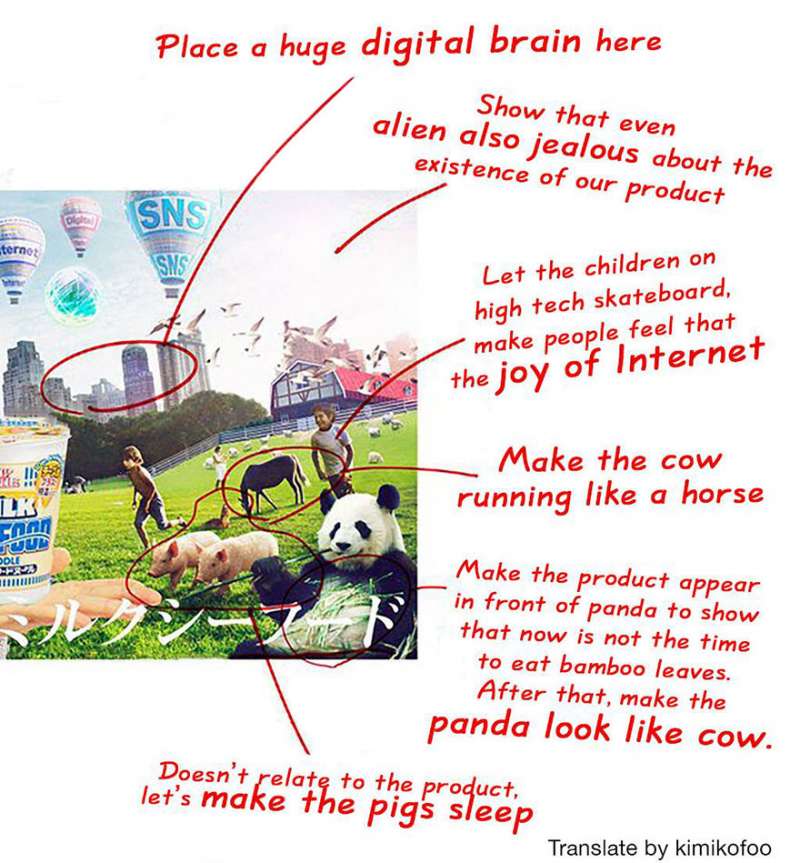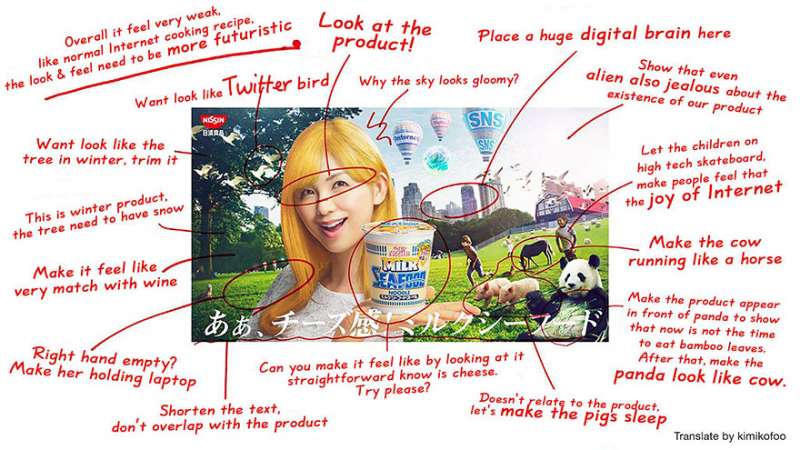 ✪設計師信心滿滿的把修改後的作品交給老闆,沒想到這才是真正的地獄。老闆又一次表示「這個口味要冬天銷售,做點積雪出來」、「旁邊的樹要冬天的感覺」、「海鮮味和紅酒很般配」、「廣告語太長,改成啊啊!起司的感覺」、「Model右手沒有東西很奇怪」、「動物很多餘」、「加上一些科技感的東西,這樣俗的熱氣球換掉」、「熊貓還在吃竹子,是我們的泡麵不好吃嗎?」。