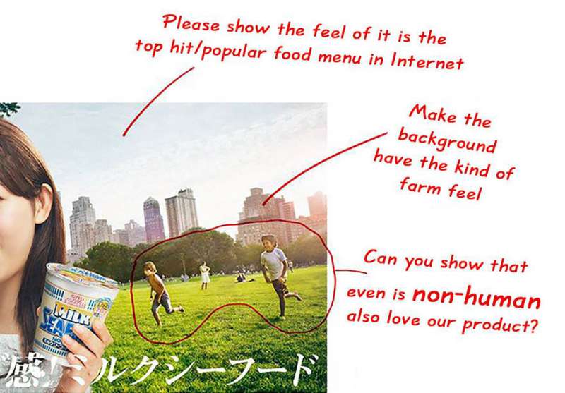「背景要做出牧場的感覺」、「草地上除了人類,還要體現出我們的起司海鮮泡麵很受歡迎的感覺」、「Model要笑出來,嘴巴要笑、眼角要笑,整個人要開心的感覺」。