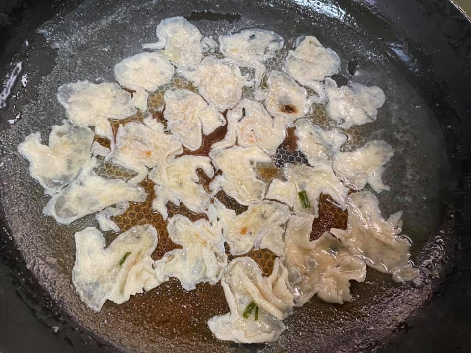 「這油不夠多呀!要先下油,鍋子均勻的沾油,均勻斜襬鍋子大概多一茶匙的量;下餃子,開火,下麵粉水,蓋蓋子,收乾時開蓋」