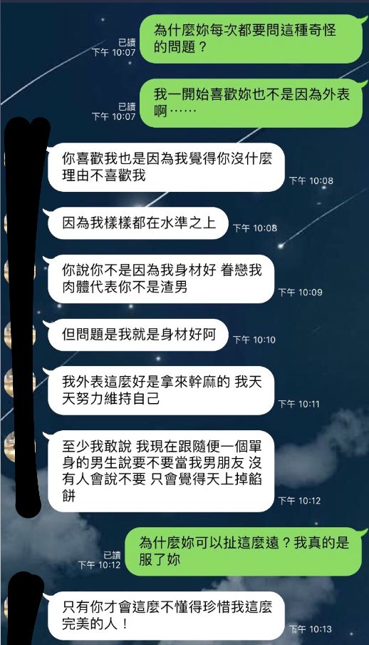 只是我沒有說的很直接,我只有在她炫耀身材的時候說:「這樣身材算普普」或是她問我她長得如何的時候,我會勉強回:「算可愛吧」