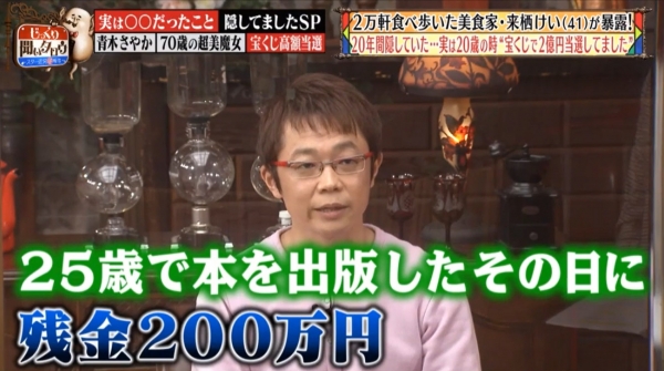 一段時間之前全台因為高達二十億的威力彩而瘋狂的時候,相信很多人都幻想了一下「一夜爆富」是什麼樣的感覺,但是如果真的成真了,你會怎麼樣花你的錢呢?日本有一名叫「來栖けい」的41歲男子,他25歲時出版了一本食評書《美食的王者》,詳細介紹、點評了日本上百間超水準的西餐廳和菜式。