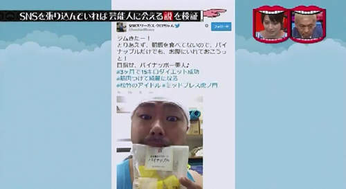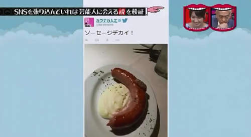 此外,很多人喜歡拍食物的照片上傳,有沒有可能光憑著食物的照片就找到人呢?實驗的目標是入江慎也,他在推特貼出一張香腸的照片,寫著「好大的香腸!」
