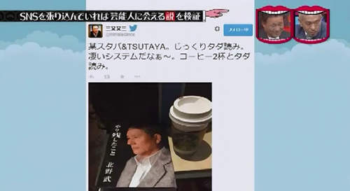 目首先請專業的偵探公司在電視台內設立推特調查中心,嚴密監控藝人們的推特動態,第一個被鎖定的目標是搞笑藝人三又又三,他在推特貼出一張星巴克與TSUTAYA(量販店)複合店面喝咖啡照片: