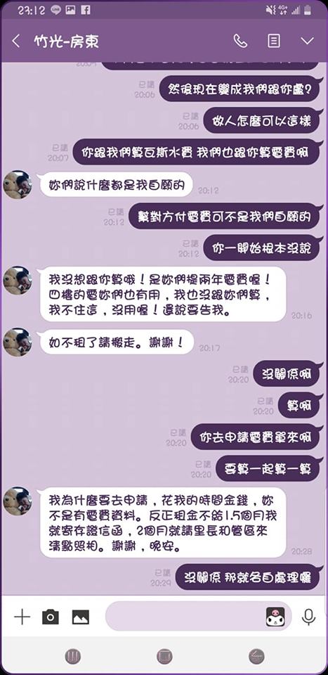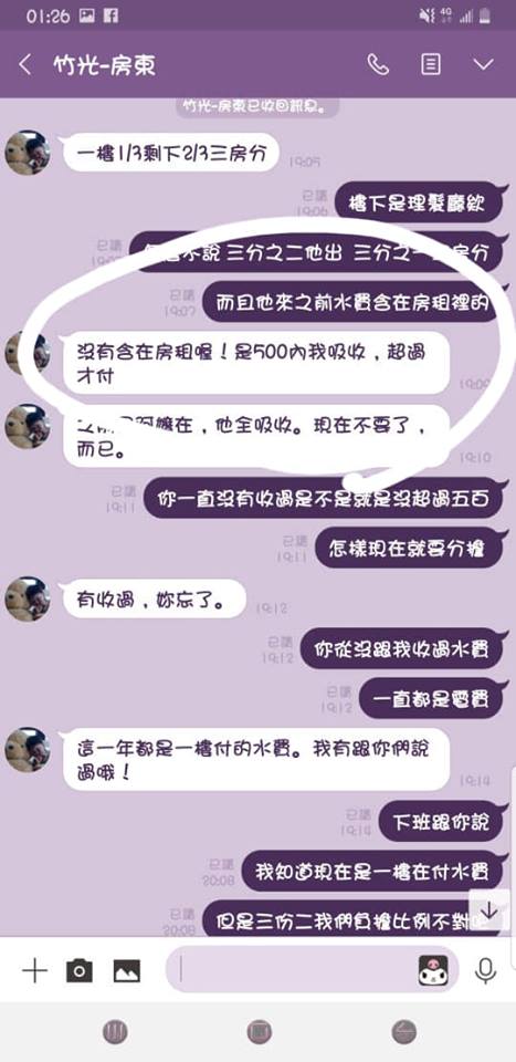 後來,原PO在忍無可忍之下質問房東,對方才鬆口坦言,對面房客的確沒有電費單,還口口聲聲答應會處理,結果等了好幾天也不見消息,直到付租金的日子再次來臨,房東的態度有如180度大轉變,竟反過來跟她清算2年以來的水費及瓦斯費,轉移話題說水費原本就沒有包含在房租裡,過去一年都未曾收工,是因為都是一樓的理髮院全吸收,但現在不要了,所以二樓的原PO必須付2/3,讓原PO越聽越覺得不合理。