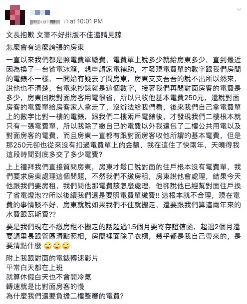 後來在沒辦法之下,原PO只好自己拿電費單,去比對1、2樓的電表,果然發現她所住的2樓,根本就只有一張電費單,「所以我除了繳自己的電費外,我還包了2樓公共用電及對面房客的電費!」而她再聯想到房東先前說過的,每月都會跟對面房客收取「基本電費250元」,但從來卻沒有自她的電費單受扣除過,讓她受不了崩潰大喊:「天曉得我這段時間到底多交了多少電費!」