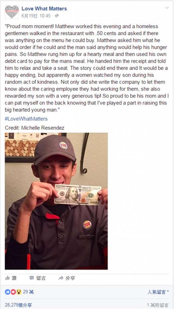 世界其實很溫暖。美國德州男孩Matthew Resendez在當地的漢堡王工作。那天他上班時,一名衣衫襤褸的街友走了進來。對方掏出一堆硬幣,想要買點東西吃。Matthew沒有冷言冷語,他接下來做的事讓人非常感動。