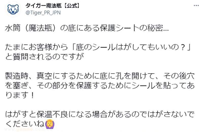 日本知名家電廠商虎牌(Tiger)表示:「分享一個關於保溫瓶底部貼紙的祕密……我們偶爾會接到客人詢問『底部的貼紙可以撕掉嗎?』的問題。