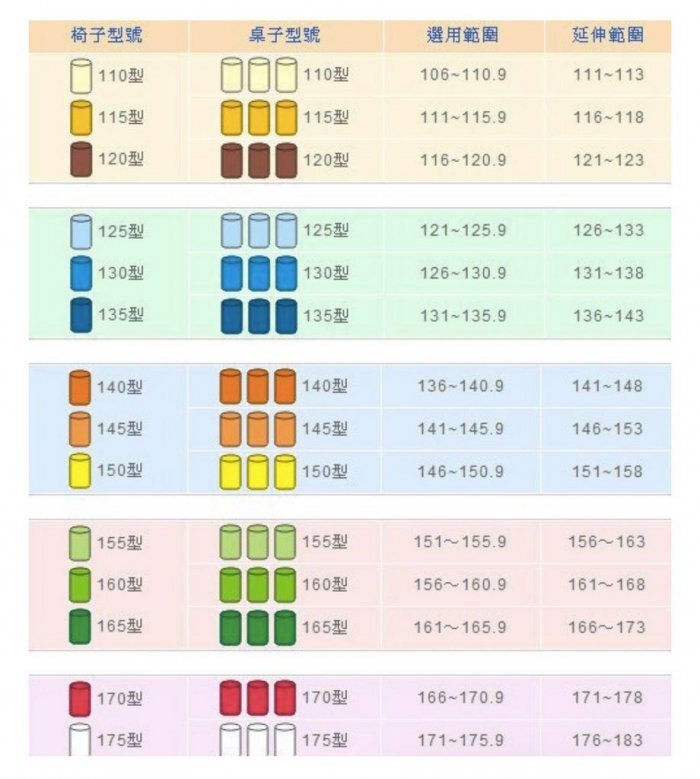 從原PO分享的照片中可見,每個圓柱體都有自己的型號,顏色也不一樣,大致可以分為5大類,106公分至120公分為黃色系圓柱體,121公分至135公分為藍色系圓柱體,136公分至150公分為橘色系圓柱體,151公分至165公分為綠色系圓柱體,165公分至170公分為粉色圓柱體,171公分至175公分為白色圓柱體。
