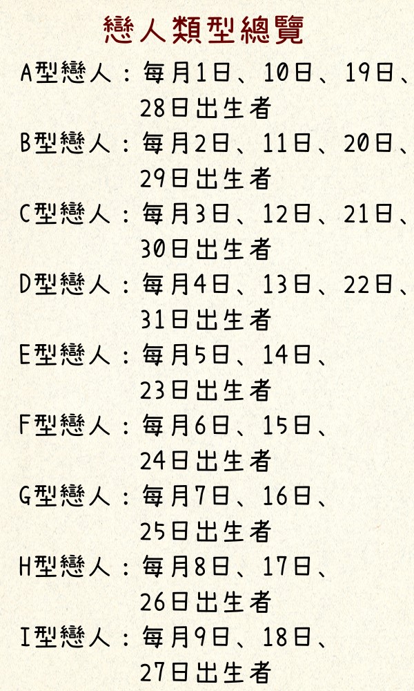 結果:A型戀人:每月1日、10日、19日、28日出生者