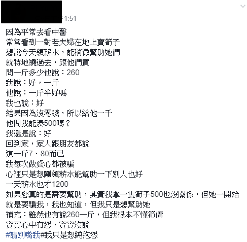 感嘆自己每次做善事都被騙,更坦言,其實就算看到一支筍子500也沒關係,只是「她一開始就是要騙我,我也知道,但我只是想幫助她!」
