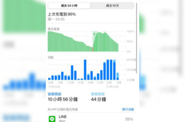 只要將手機電池的選項截圖下來,就能看見使用手機的時段、App以及電池消耗量。