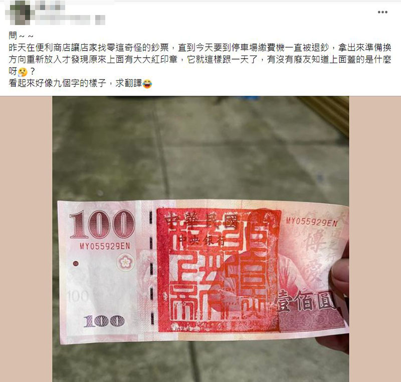 原PO在臉書「爆廢公社」的文章中提到,拿大鈔到超商買東西找零時沒有仔細看,就把一張蓋有超大紅色印章的百元鈔票放進錢包,直到後來在停車場使用繳費機時,因為機器一直退鈔,他拿出來想換個方向再試一次,這才發現鈔票上的印章,「它就這樣跟一天了,有沒有廢友知道上面蓋的是什麼呀?」
