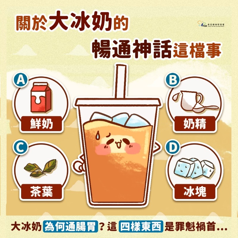 食藥署在粉專「食用玩家」發文表示,早餐店大冰奶總被說成是通腸的神奇魔法,大冰奶每喝必拉究竟是都市傳說還是真有其事,這跟調製大杯冰奶茶的原料息息相關。早餐店大冰奶中的冰塊、奶精或鮮奶、茶水每一樣都是通腸神器,當結合在一起時通腸效果更是加倍。